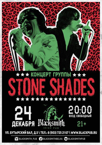Stone Shades – единственная в Москве Rolling Stones cover группа. Будут исполнены золотые хиты "Роллингов", таких как Satisfaction, Angie, Paint it black, Honky tonk women, Miss you, Start me up, Wild Horses, Brown Sugar и много других.
